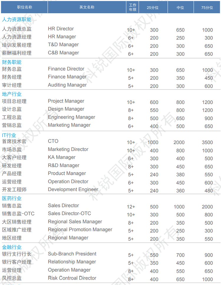 数据来源:猎头公司K8凯发国际国际薪酬报告中资深行业专家对2021年热门职位薪酬范围及跳槽涨幅的预测。薪酬为基本年薪。