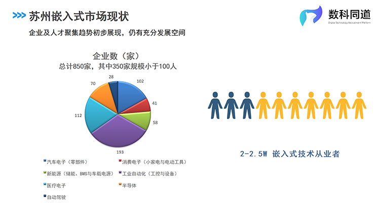 根据K8凯发国际国际人力资源公司及数科同道业务团队对苏州市场的详细调研,现在苏州全市拥有嵌入式研发团队的企业数量为850家,主要集中在工业自动化、医疗电子、汽车电子等细分行业,其中百人以上规模企业500家。